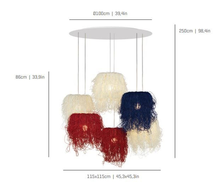 Lampa wisząca Chaos to oryginalna propozycja oświetlenia do nowoczesnych przestrzeni. Designerska lampa sufitowa od Aruro Alvarez składa się z 6 abażurów, trzy z nich mają kolor biały, dwa czerwony, a jeden niebieski. Dzięki temu lampa wygląda niezwykle wyraziście i stanowi wyjątkową ozdobę przestrzeni. Do lampy wiszącej Big Compo Chaos należy dokupić żarówki.