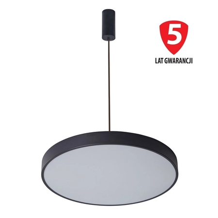 Lampa wisząca Italux Orbital to nowoczesne oświetlenie sufitu, które zachwyca niebanalnym designem. Minimalistyczna lampa wisząca składa się z delikatnego zawieszenia i płaskiego dysku, który zamknięty jest w czarnym pierścieniu. Lampa wisząca LED zawiera zintegrowane źródło światła, które generuje strumień o zwiększonej jasności 3600 lumenów. Do emisji takiej jasności lampa pobiera 60W mocy.